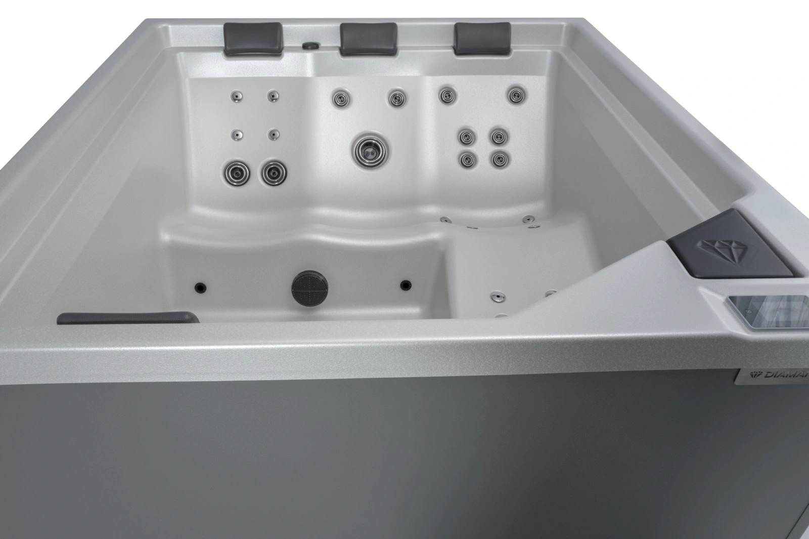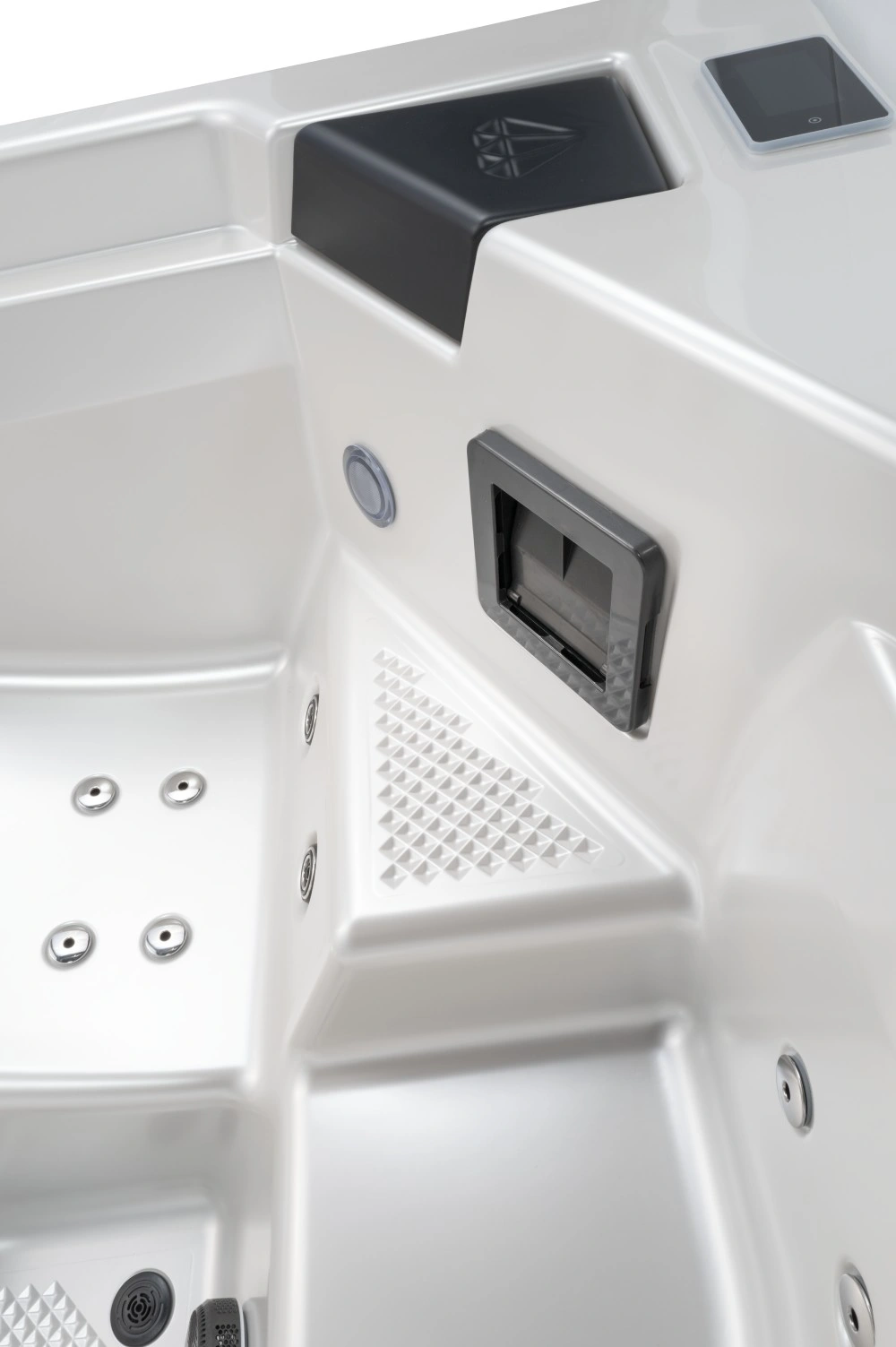 Diamant SPARK är både praktisk och mångsidig: dess mått gör att den kan passera genom standarddörrar, vilket gör den lämplig för både nya installationer och befintliga byggnader. Ett pålitligt och mångsidigt spa för familjelivet.